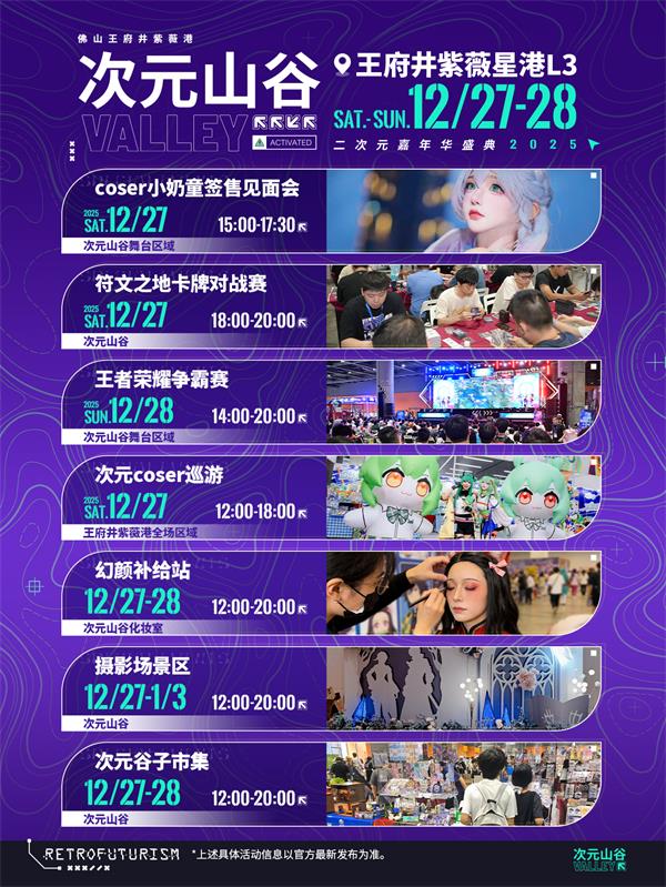 开街活动时间为12月27日-28日12:00-20:00,值得注意的是,3大主题摄影区将持续开放至2026年1月3日,未能在活动周末到场的爱好者仍可前往打卡。活动地点位于佛山王府井紫薇港L3层「次元山谷」。