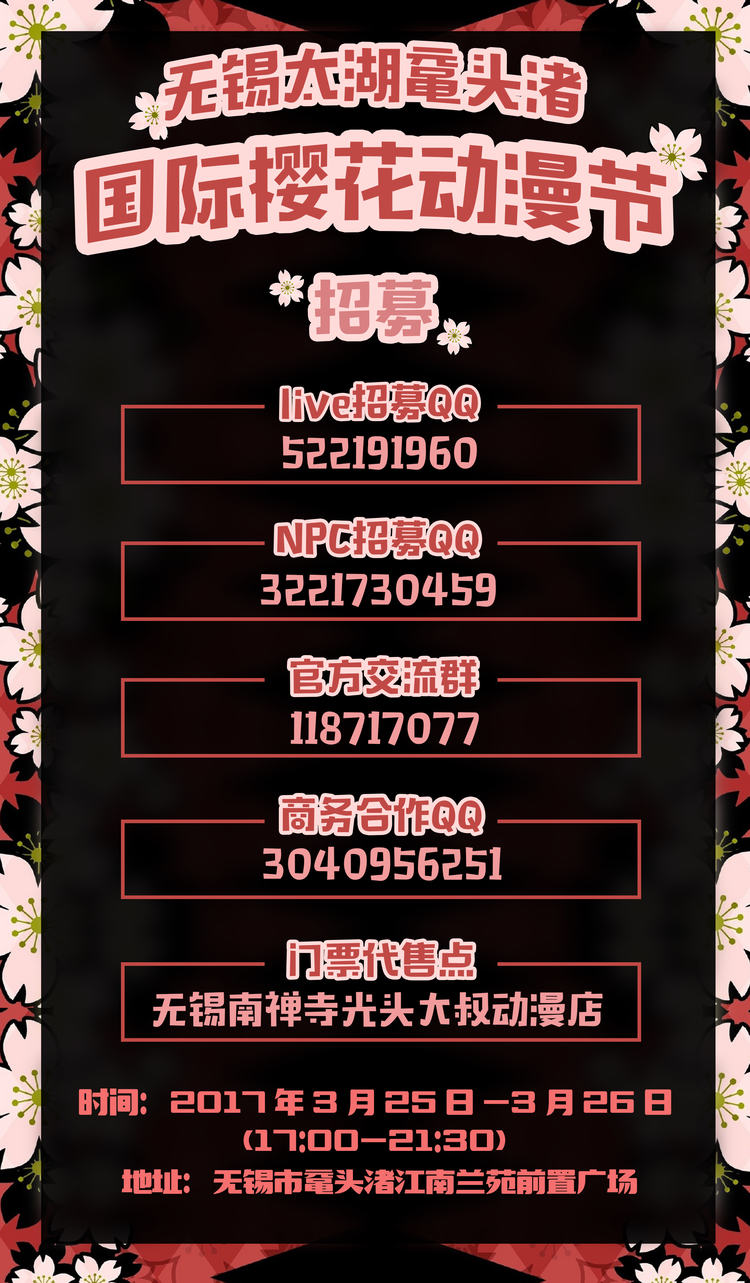 无锡太湖鼋头渚国际樱花动漫节,露天夜场盛典,再度强势袭来!这次我们邀请到熊祁,冷冷,少恭,CB,银耳娘,萍萍,傅小司,希小白8位嘉宾助阵现场,来体验一场樱花与二次元的超强碰撞吧~现场更有阴阳师场景还原还能在跳跳谷跟矮马亲密互动,更多美食吃不完,超炫舞台等你来看!!