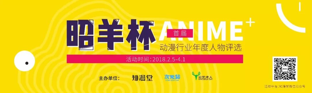 2018.2.5-2018.4.1由“北京动漫文化交流锋会”独家赞助,“知漫堂”、“次元站”、“云艺术人”共同主办的“昭羊杯”首届动漫行业年度人物评选,历时54天终于落下的帷幕。“昭羊杯”共收到32位参赛者的报名信息,其中动画原创公司16位、动画制作公司4位、漫画原创公司14位。在这几十天的角逐中,共计23861人参与了此次动漫行业年度人物的投票,现将结果公布如下(每组公布前5):
