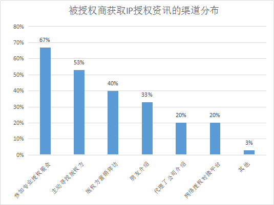 在IP授权咨询的渠道方面,可供双方选择的高效平台和途径显得尤为缺失,很多被授权商选择只能通过专业授权展会(70%)来获取相应的信息咨询,其余只能依靠自己主动寻找版权方(53%)和版权方营销拜访(40%)。