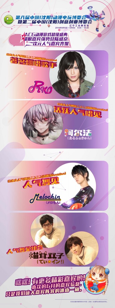 强势嘉宾阵容在第八届中国(沈阳)动漫电玩博览会如约和大家相聚在辽宁省工业展览馆了~~我们将整装出发,以崭新的姿态,带给你不一样的(沈阳)ACG。