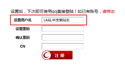 这里设置一个登陆的用户名(这个用户名是为了日后LA站的app的登陆使用),这个用户名可以随便设置(只要您记住就可以,可以是qq好,信箱,或者常用用户名)